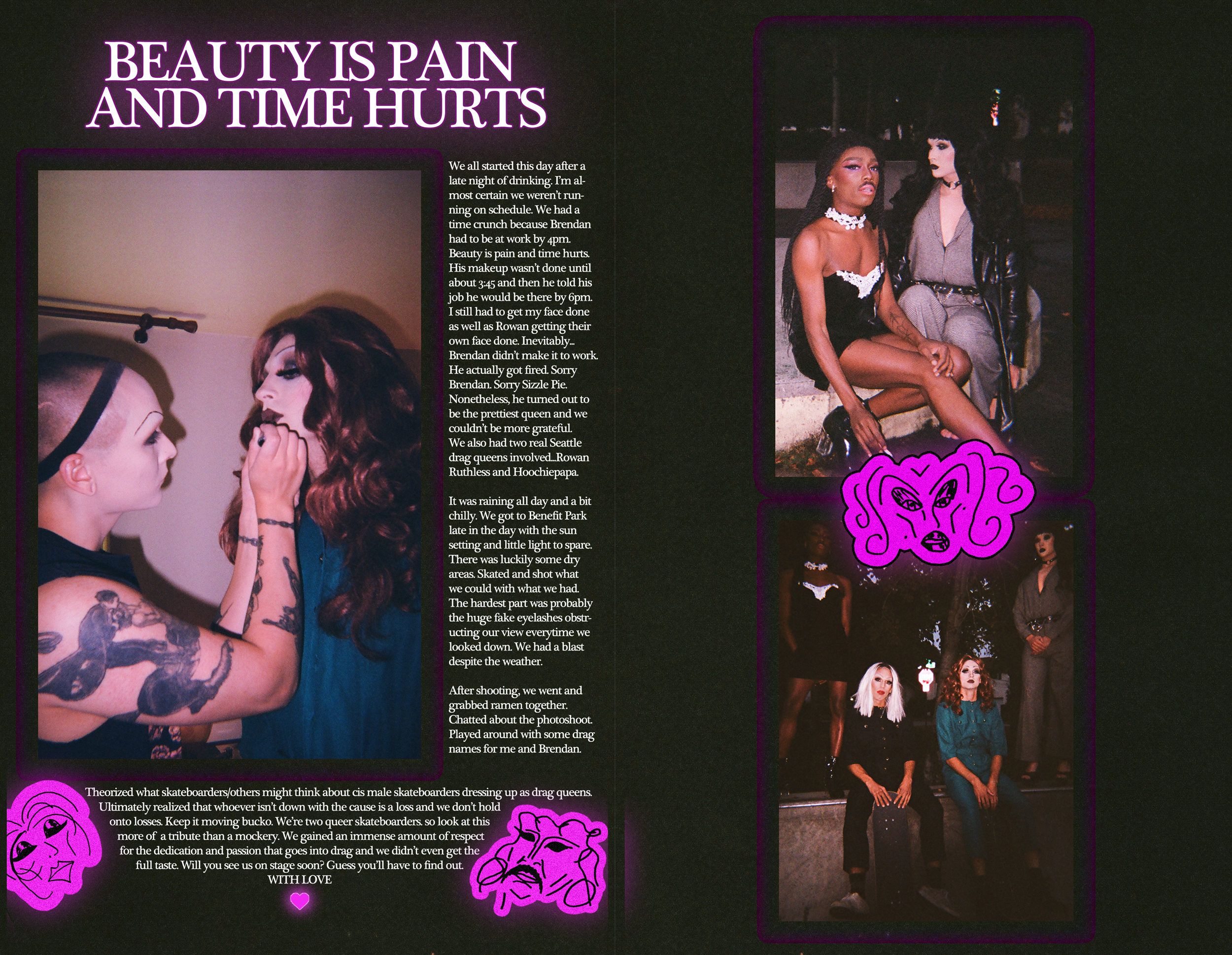 Birthed through a contest held by Thrasher Magazine & 35th North skate shop in Seattle titled ‘Zine Thing Challenge.’ Ten teams of skateboarders were given (2) Kodak Fun Saver cameras, two weeks to shoot photos, and two weeks to assemble a zine. Each team had to include an interview, a fake advert, and one essay or editorial.